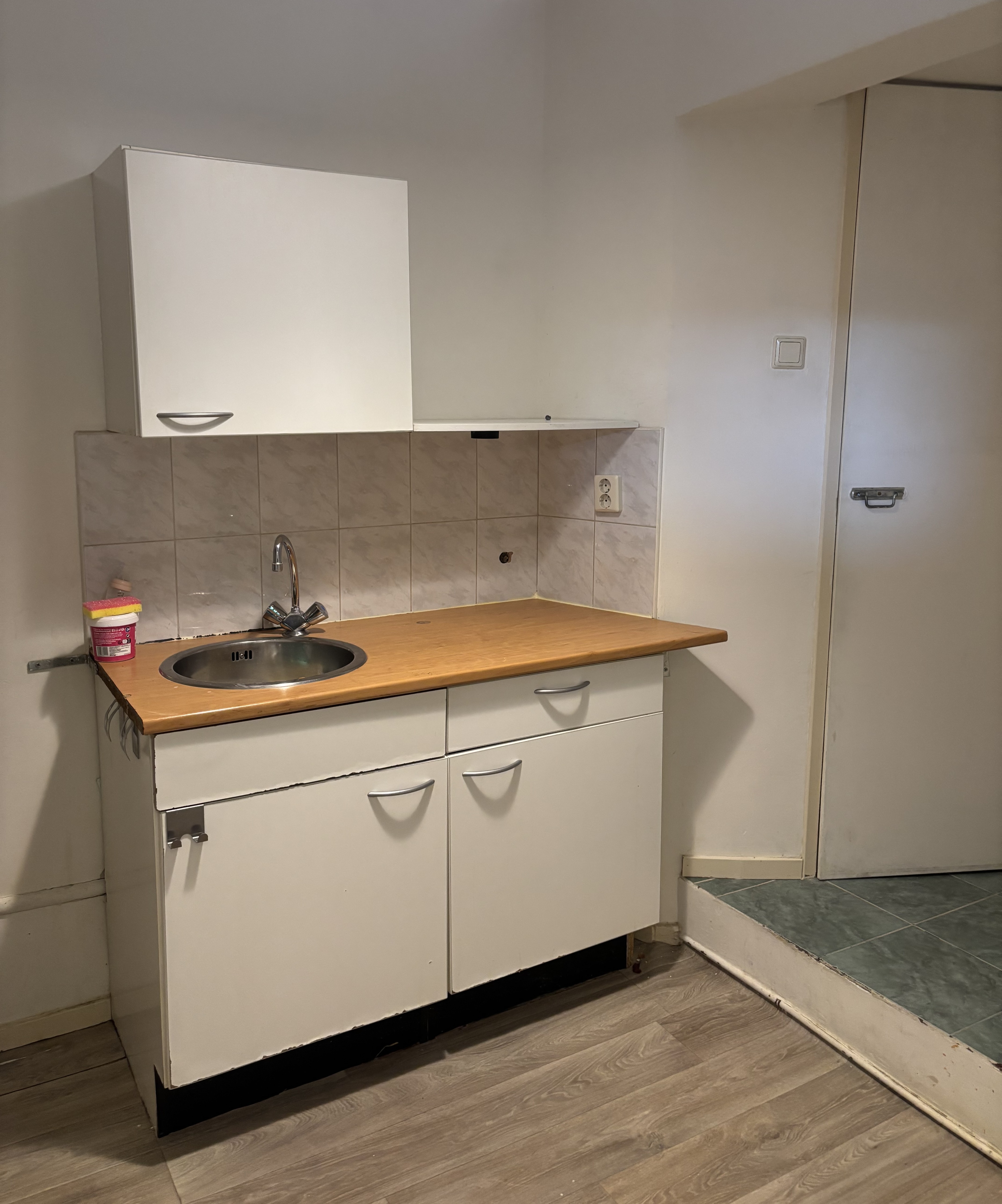 De woonkamer, keuken en badkamer (met douche, wastafel en toilet) zijn gelegen op de eerste verdieping.