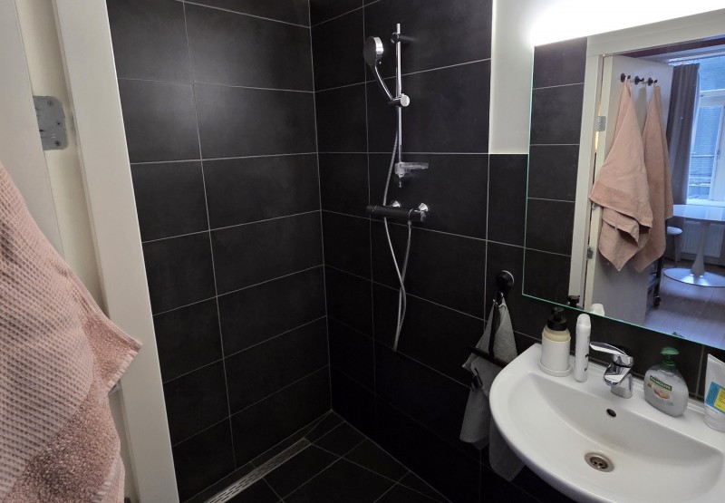The surface of the studio is approximately 26 m². The studio has its own bathroom and toilet and the kitchen is shared with 5 other roommates. In addition, together you share a roof terrace of approximately 40m2.