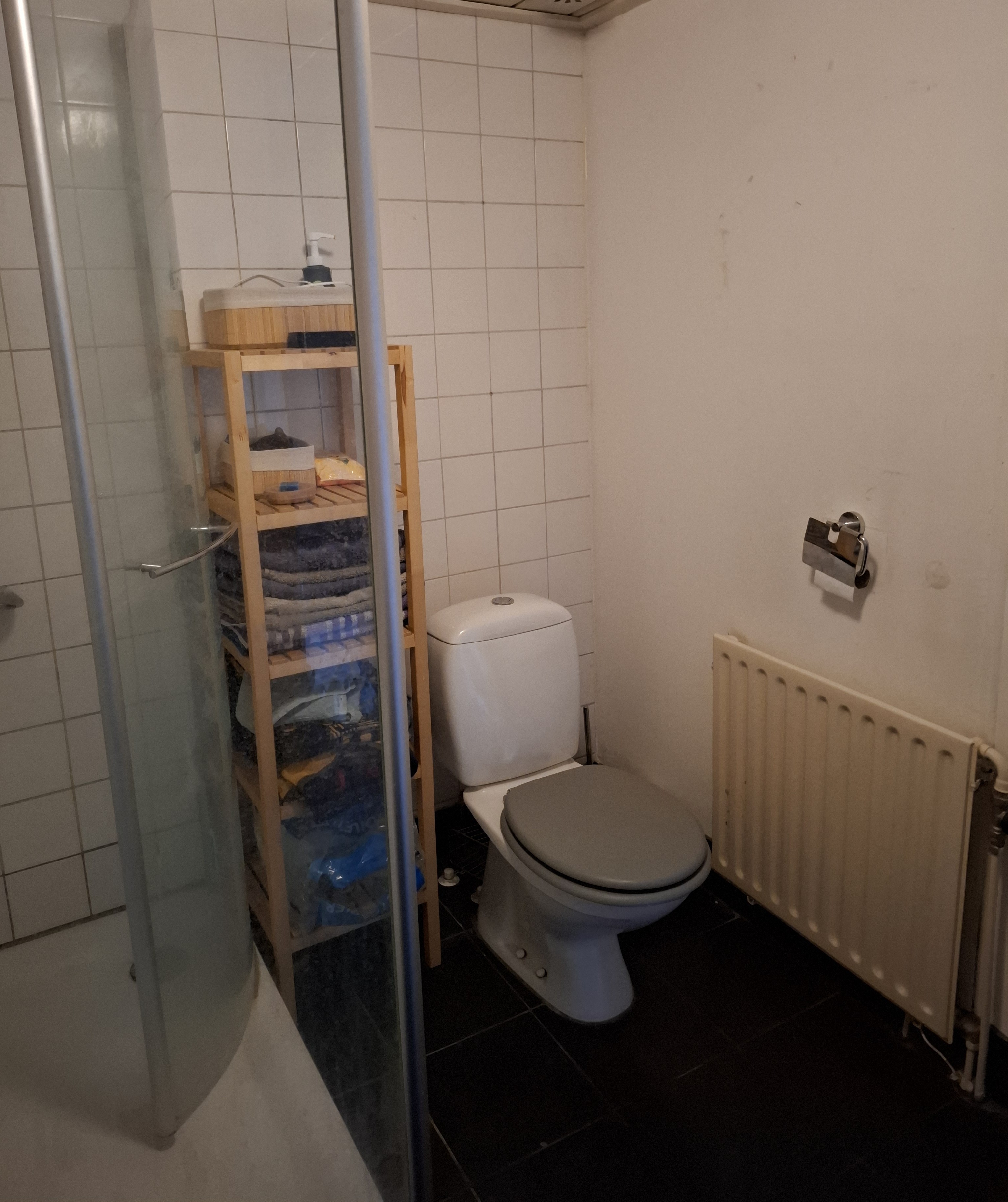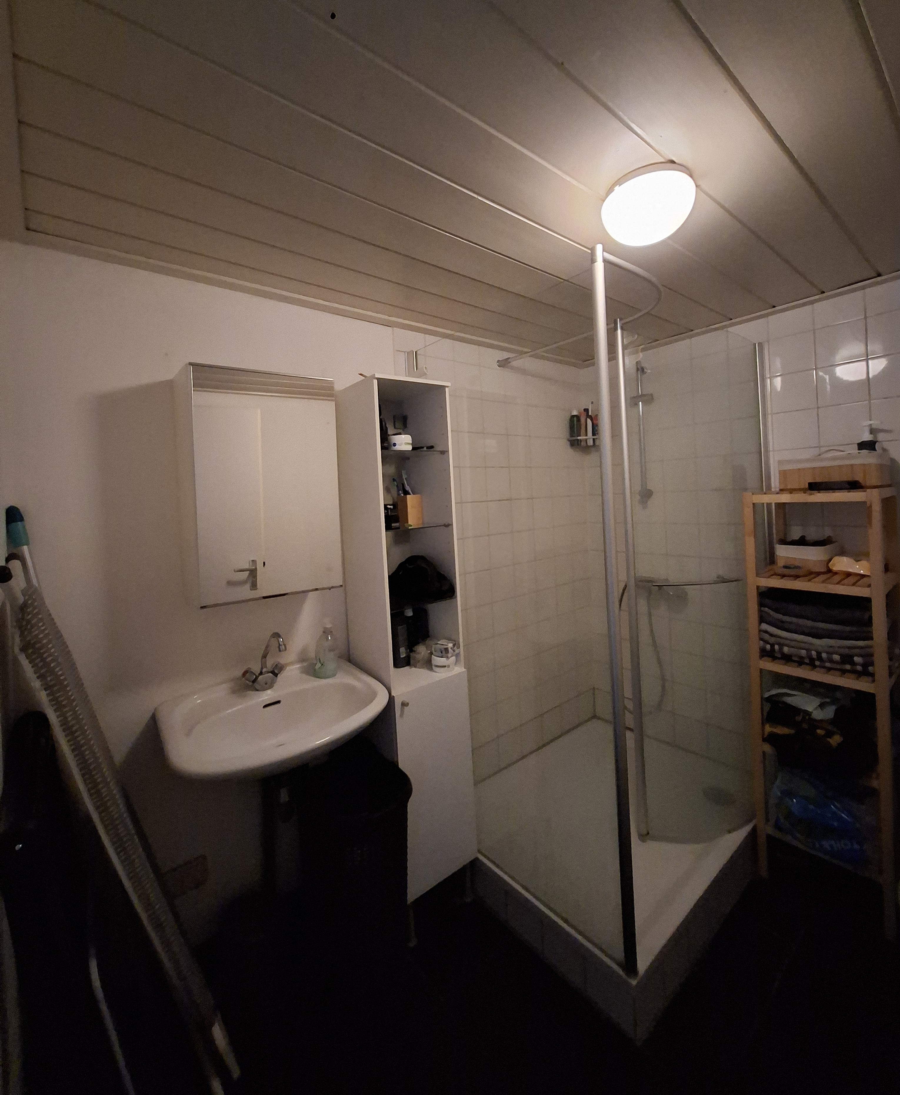 - een badkamer met douche en wastafel