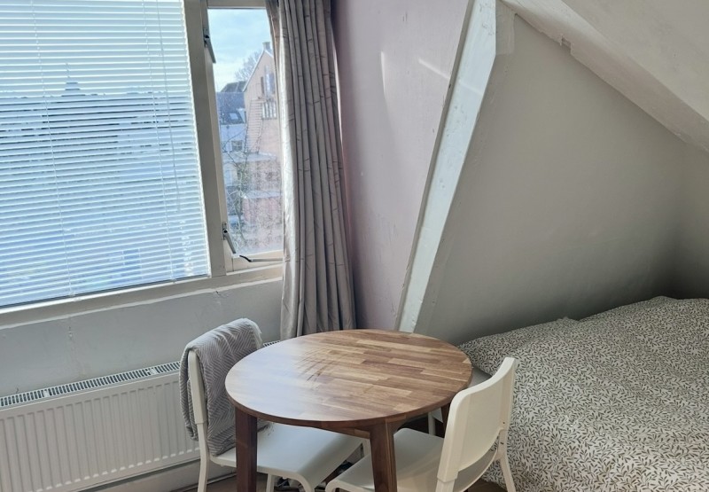 Deze kamer van ca. 13 m2 is gelegen op de 3e verdieping. Douches en toiletten worden gedeeld met medebewoners.